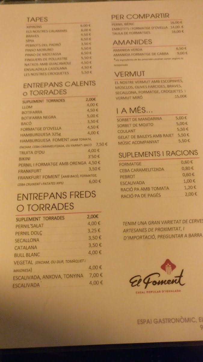 The menu at Casal Popular D'igualada, El Foment offers a delightful mix of traditional and contemporary dishes, making it a true culinary gem in Igualada. One of the highlights is the Vermut Calen, a refreshing aperitif that sets the perfect tone for a meal. For those who appreciate a good beer, the Epidor By Moritz provides a smooth, flavorful experience that pairs wonderfully with many of the dishes on offer. The sandwiches are especially worth mentioning, with the Entrepa de Baco standing out as a savory and satisfying option. The combination of carefully selected ingredients and traditional techniques ensures that each dish is both comforting and bold in flavor. Whether you're here for a casual bite or a more leisurely meal, the menu caters to all tastes with its approachable yet refined selections.
